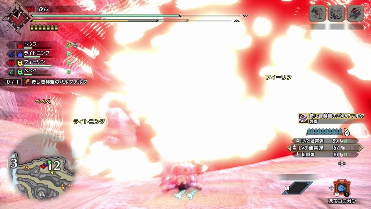 最近はバクレツの実を節約するために王牙砲の通常弾戦でやってます。 主に羽根の根元のめっちゃ小さい場所領域だけがボウガンでの弱点なんで、そこ狙うんですよね。 ブースターが付いた大きな部分は炎を纏ってないときには堅いんで、それ以外はこのヒンジの部分を狙うのが吉ですね。 徹甲ならどこでも一定のダメージ入るんで良いんですけど、徹甲榴弾はやっぱりよそ行きの服ですな〜。 昨日はバルファルク戦で2人ほど徹甲ヘヴィーに会いました。 一人は拡散打ってたね。 やっぱりバルファルクには徹甲ってのが定番なのかもね。
