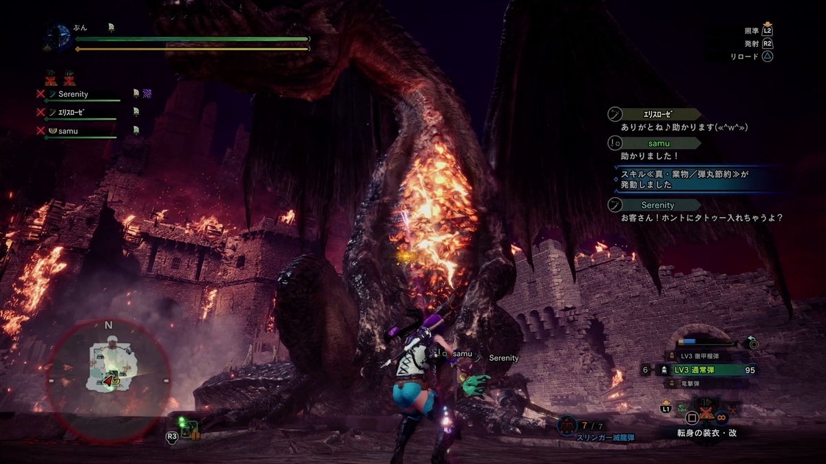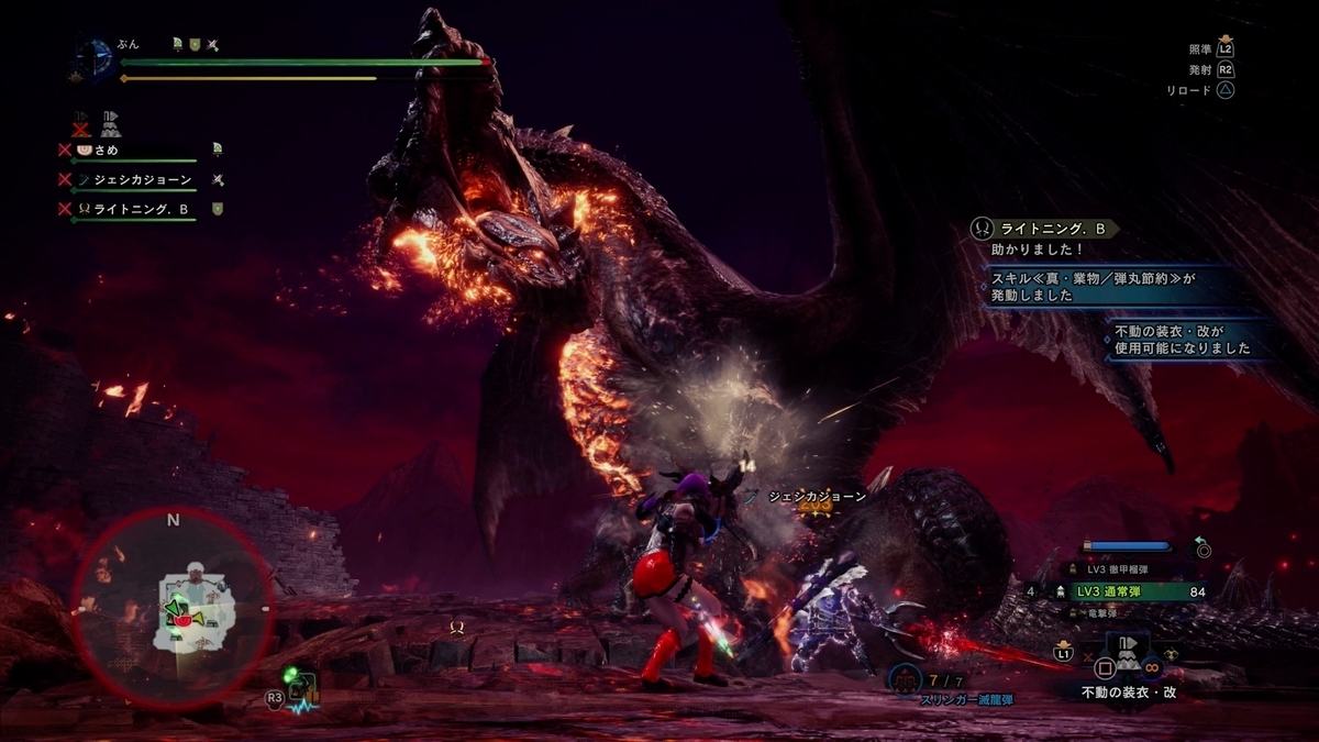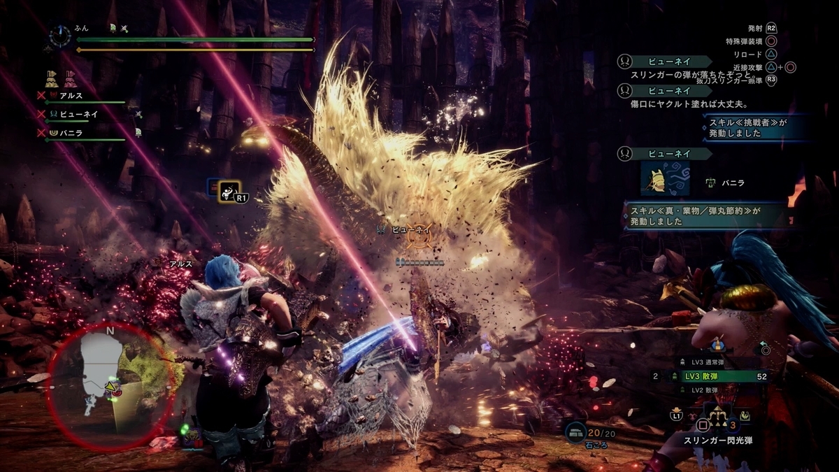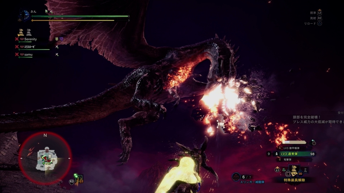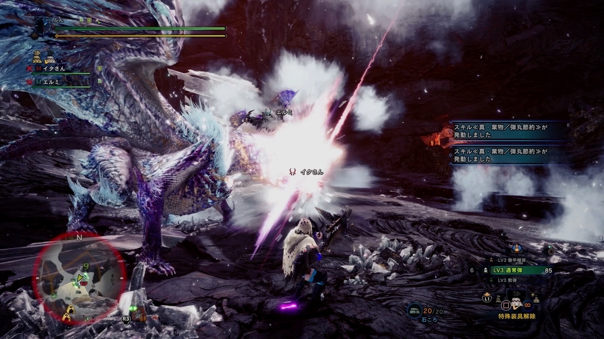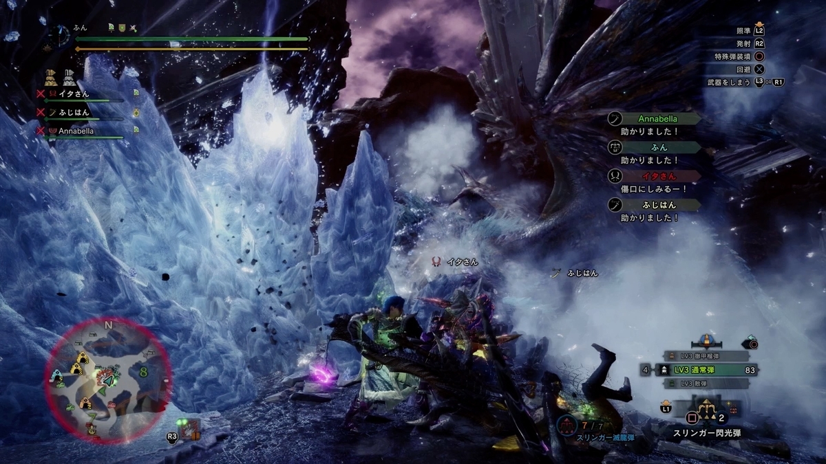お〜、縦氷柱ブレスを躱しながら頭狙ってマスね。 3人が丁度映ってて構図的にも光的にも良い感じですわ。