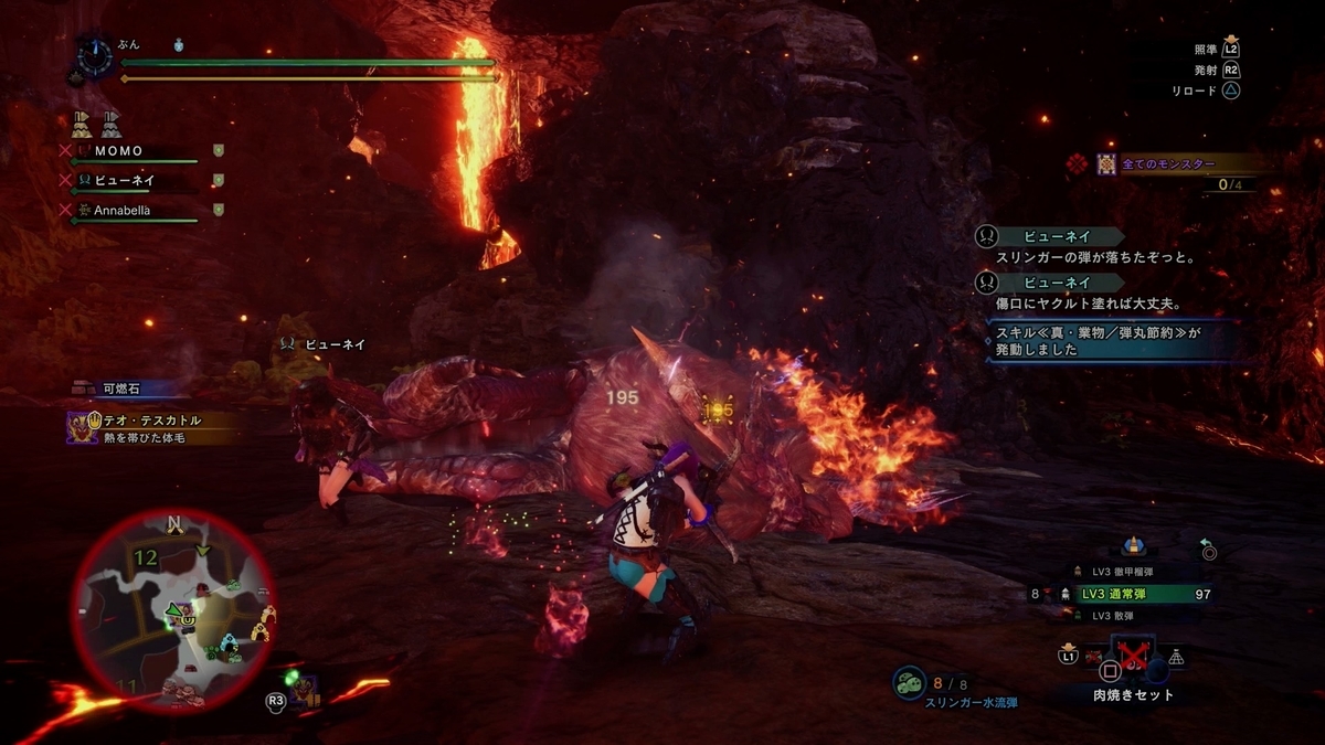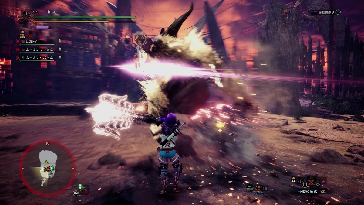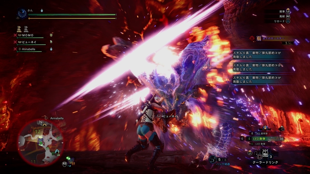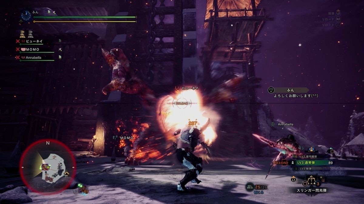 ビューネイ、Annabella、MOMOさんと滅日っすね。 MOMOさんがまだモンハン初心者さんなんで、ビューネイさんが手取り足取り指導してましたw。 これも装飾品だしだね。