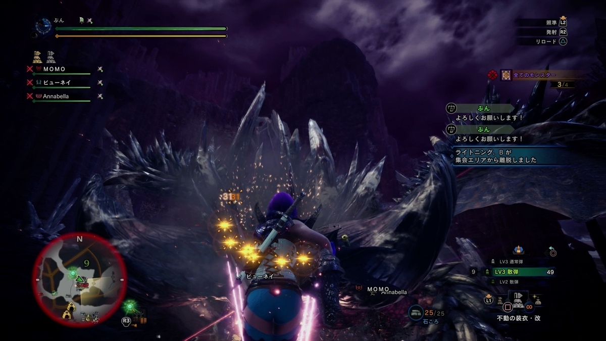 MOMOさんのハンターネームをイエローにしようって事で行って来ました。 ビューネイ、Annabellaさんと。 これ上位じゃないんですけど4体連続で出てくるので、少し体力調整されてる感じですね。 昔の防具や武器だと時間かなりぎりぎりだったり、乙の嵐でなかなかクリアー出来なかったりした覚えがありますけど、今の防具と武器だとまあ凄く簡単に終わっちゃいますね。