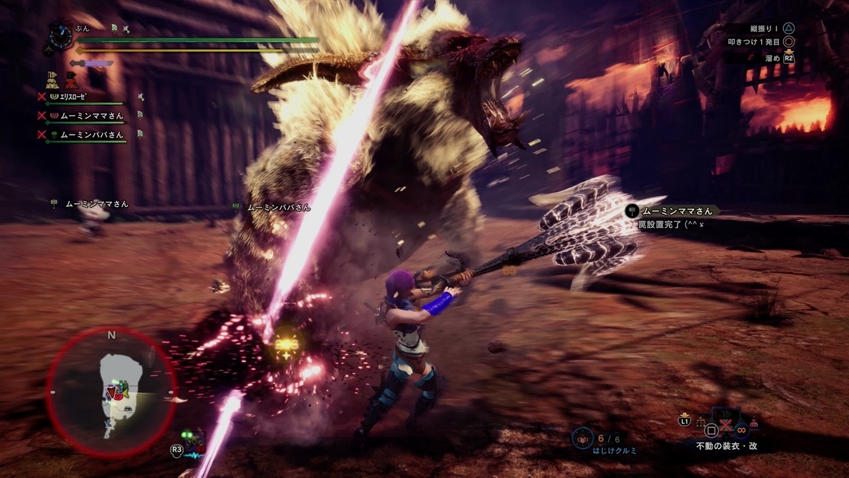 エリスローゼさんとあと野良で夫婦さんですかね? ムーミンパパとムーミンママのハンマー3人で行って来ました。 女性の方激ラー嫌いですよね。 奥さんも強制的に参加させられたのかもw。 あとで夫婦げんかになってないといいんですけど。 これは丁度水平回転でスタン取った感じでした。