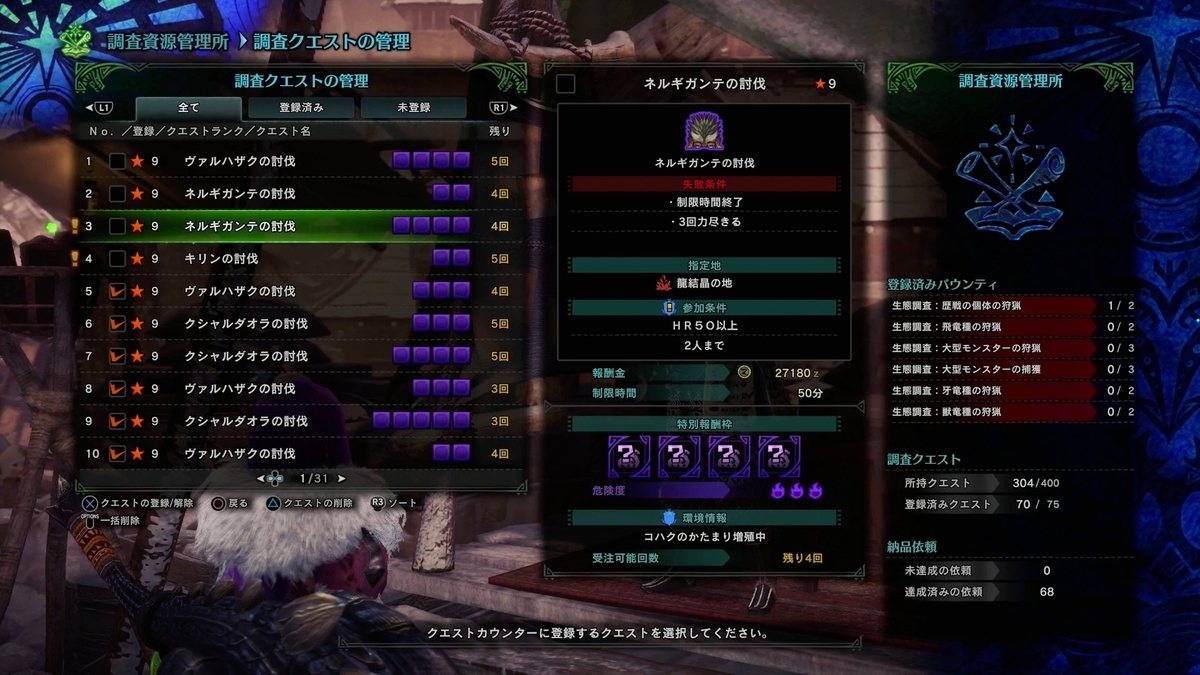 昨日午前中もちょっとやってたんですが、なかなか上位古龍の金冠は厄介なんですわ〜。 先ずは歴戦の調査クエが無いんですよね。 上位やってたときも思ったんですが、ナナとかハザクは結構出るんですが、ネルギガンテの調査クエって出る頻度が少ないんですよね。 あとマスター武器で行くと戦闘時間が極端に短くなるので、部位破壊時の調査レポートの出現率が少なくて、やってるうちに歴戦クエが貯まっていくなんて事は無いんですよ。 とにかく3枠以上の歴戦クエの調査レポートを集めることからはじめるわけですわ〜。