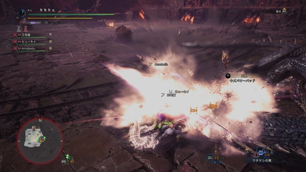 笛も移動速度上昇の自己強化掛けてると抜刀しての移動が早くて楽ですが、ハンマーも同じで結構抜刀しながらの移動が早くて良いです。 ヘヴィーだとコロリンして目的地に移動するんで、その不自由を考えると圧倒的に位置取りが楽ですわ~。 溜めたりリリースしたりするのは、今までもやってたのでその経験が役に立ちました。