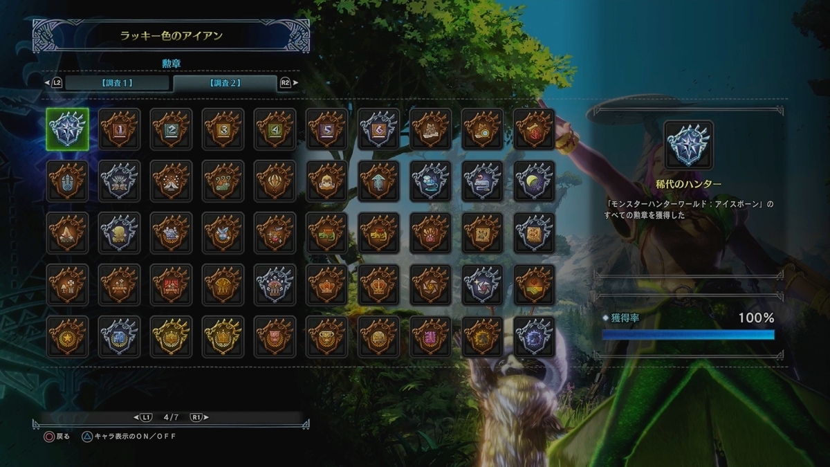 フレンドさんいないときに金冠なんかを集めてたんですが、今日はセカンドキャラのトロコンをまとめて半日ぐらいかけてやってました。オタカラ・ブルーディーバ・観察依頼。 そういったサイドクエストをクリアーしてました。 ファーストキャラの時にはクリアーするとエンブレム・勲章が表示されたんですが、セカンドだと再表示はされず、静かにトロコンした感じでした。