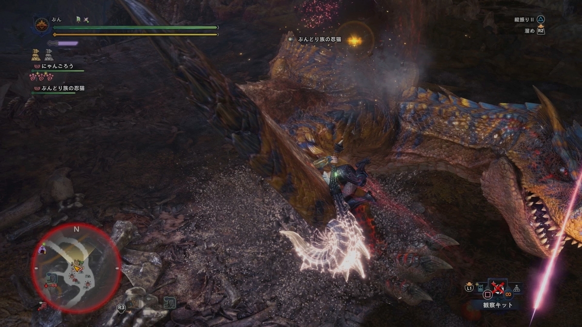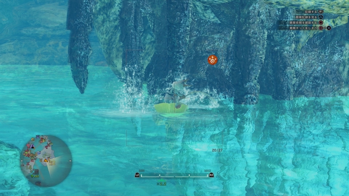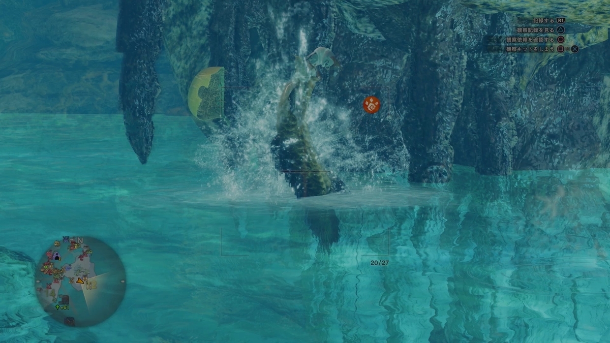 これはファーストのフンはきちんと良いタイミングで写真撮れなかったんですが、ブンは時間が有ったで取れました。 私、モンハンの内部時間を計って教えてくれるプログラムを組んで、時間が来たらもうすぐ夜ですよって教えてくれるんで、それが役に立ちました。 この観察依頼は酸の雨が降る夜に行かないと見えないんです。 一度食われて獣人族が居なくなってしまっても、その場を離れて戻ってくるとまた釣りが始まっているんで、撮影出来ましたわ。 一回目は到着したらカメラ構える前にいきなり食われてて・・。 動画の方が解りやすいから残しときます。