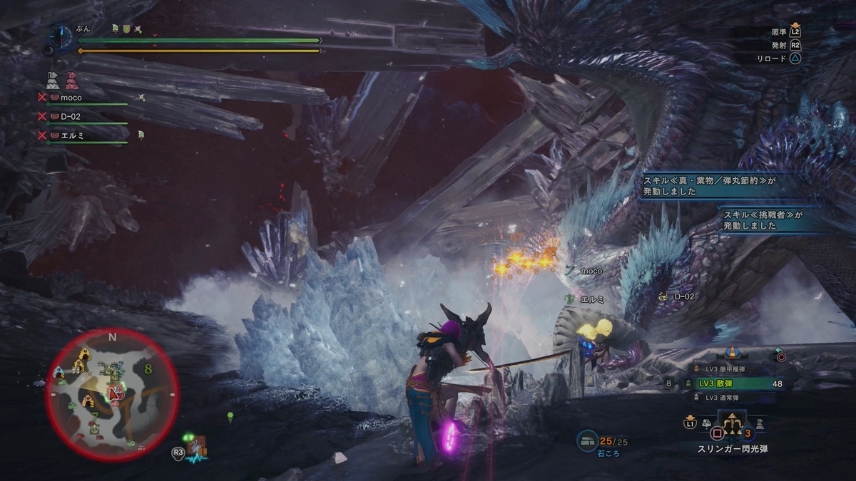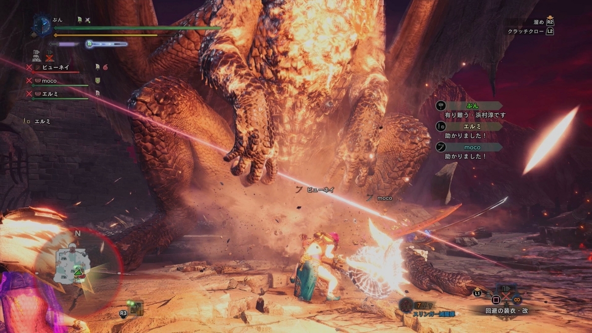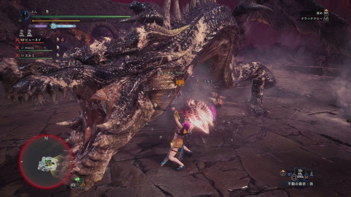 エルミさんが序盤から強打着てスタン取ってくれてたんで、後半から私も強打着てました。 でもスタンした所が丘のところで、頭が丘の中に隠れてダウン中攻撃できんやないかい。