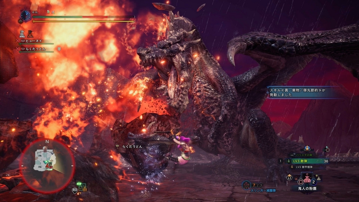 ミラの設置ブレスで吹っ飛ばされてます。 ヘヴィーは足下見えないから結構食らうんですよね。 設置ブレスって最初のラインから少しズレるのと、マージンギリギリでも当たり判定有るんで、ラインギリギリを見切ってるつもりでも被弾することあるんですよね。