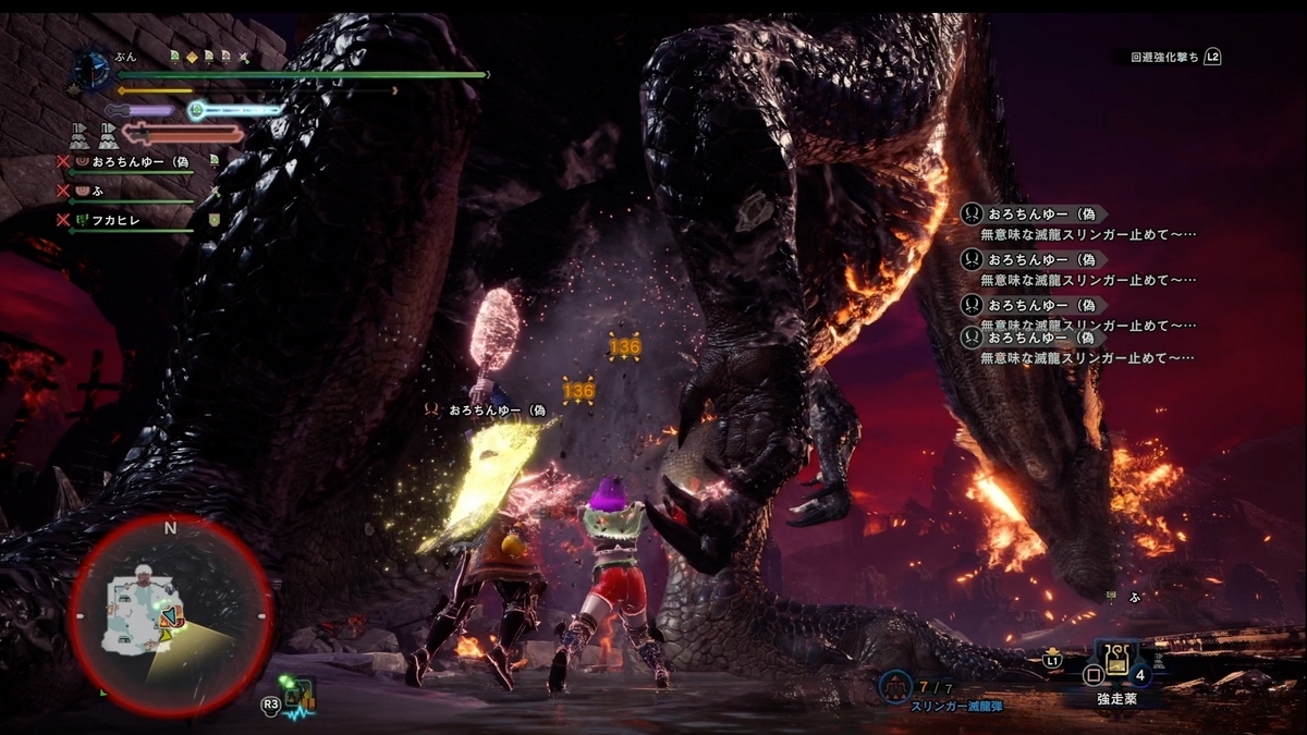 一発目は2人で入り救難を呼んだんですが、救難さんがちょっとヤバめだったんで、おろちんさん途中でキックしてました。 滅龍多用する人と転身キレちゃうと高台に逃げまくるスラアクさん・・。 もう二人で頭壊しちゃってるから、スラアクもゼロ距離開放じゃなくて地上戦での剣と斧での戦いなんですよね・・。